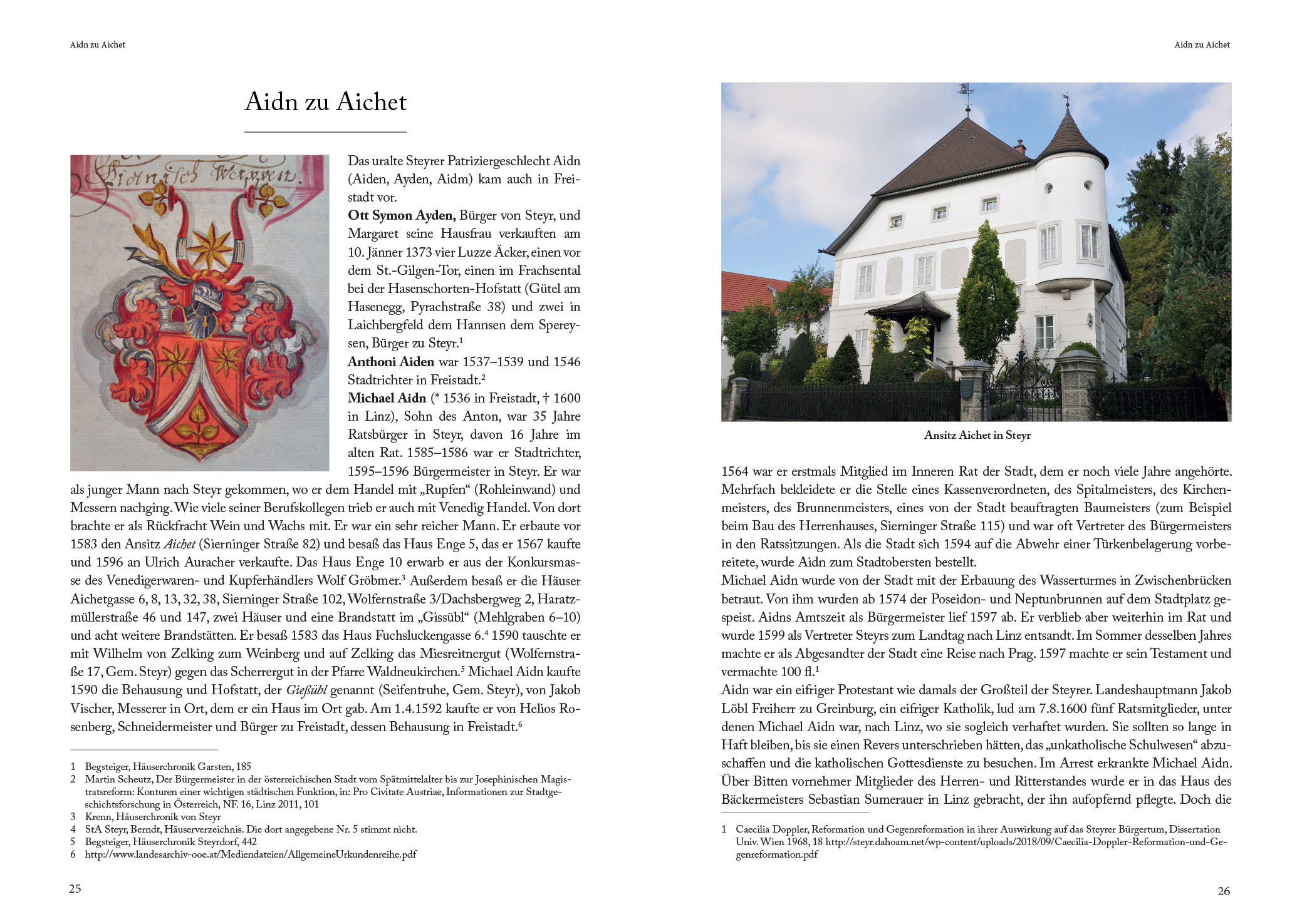 Steyr als Adelsstadt: 132 Adelsnamen von A bis Z und faszinierende Anekdoten zum Nachlesen, wie z.B. jene von Hartneid II. von Losenstein. Er zündet aus Zorn, weil er im Kloster Garsten nicht standesgemäß bewirtet wird, den Meierhof des Klosters an, der samt Vieh und Hausrat abbrennt …